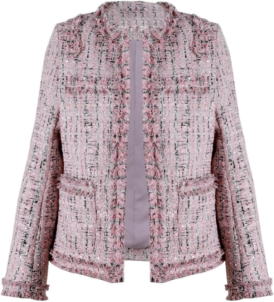 Fall tweed blazer for women featuring round neck & open front placket, long sve, front patch pockets, fully lined, intentionally fringe design